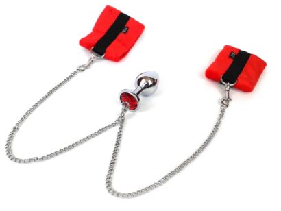 Art Of Sex Handcuffs With Metal Anal Plug M — металлическая анальная пробка с красным кристаллом, к которой зафиксированы фиксаторы для рук на прочной цепочке.