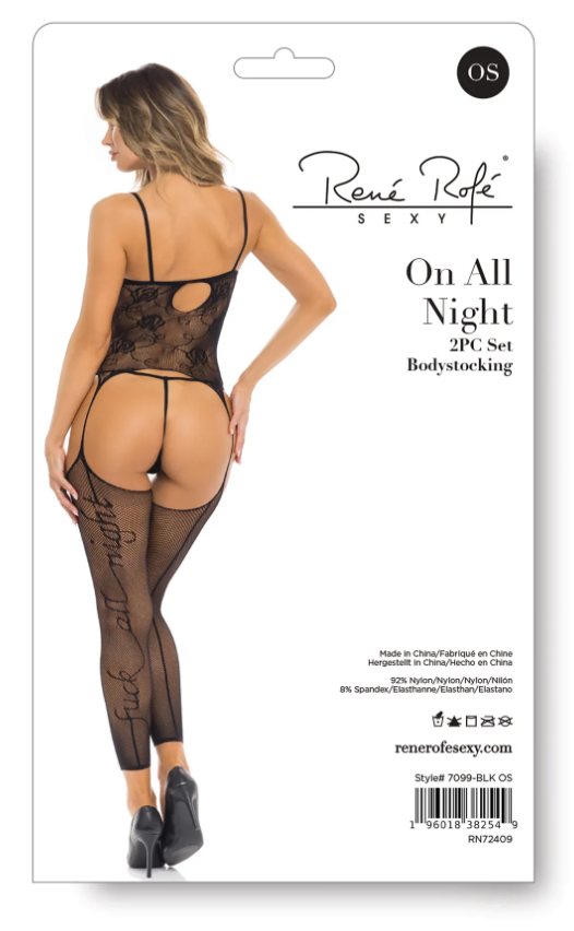 On All Night — крутой, сетчатый секси комбинезон, который имитирует майку, соединенную с чулками с обрезанным низом.