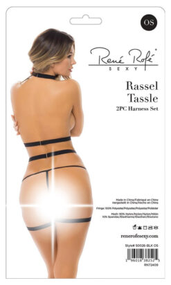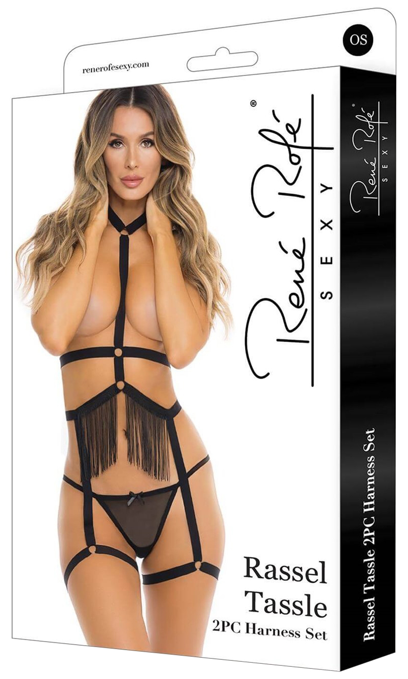 Rassel Tassle 2pc Harness Set — дерзкий и невероятно стильный секси-комплект, который удивит Вас своим необычным фасоном. Он состоит из откровенной портупеи с бахромой и классических стрингов из прозрачной ткани.
