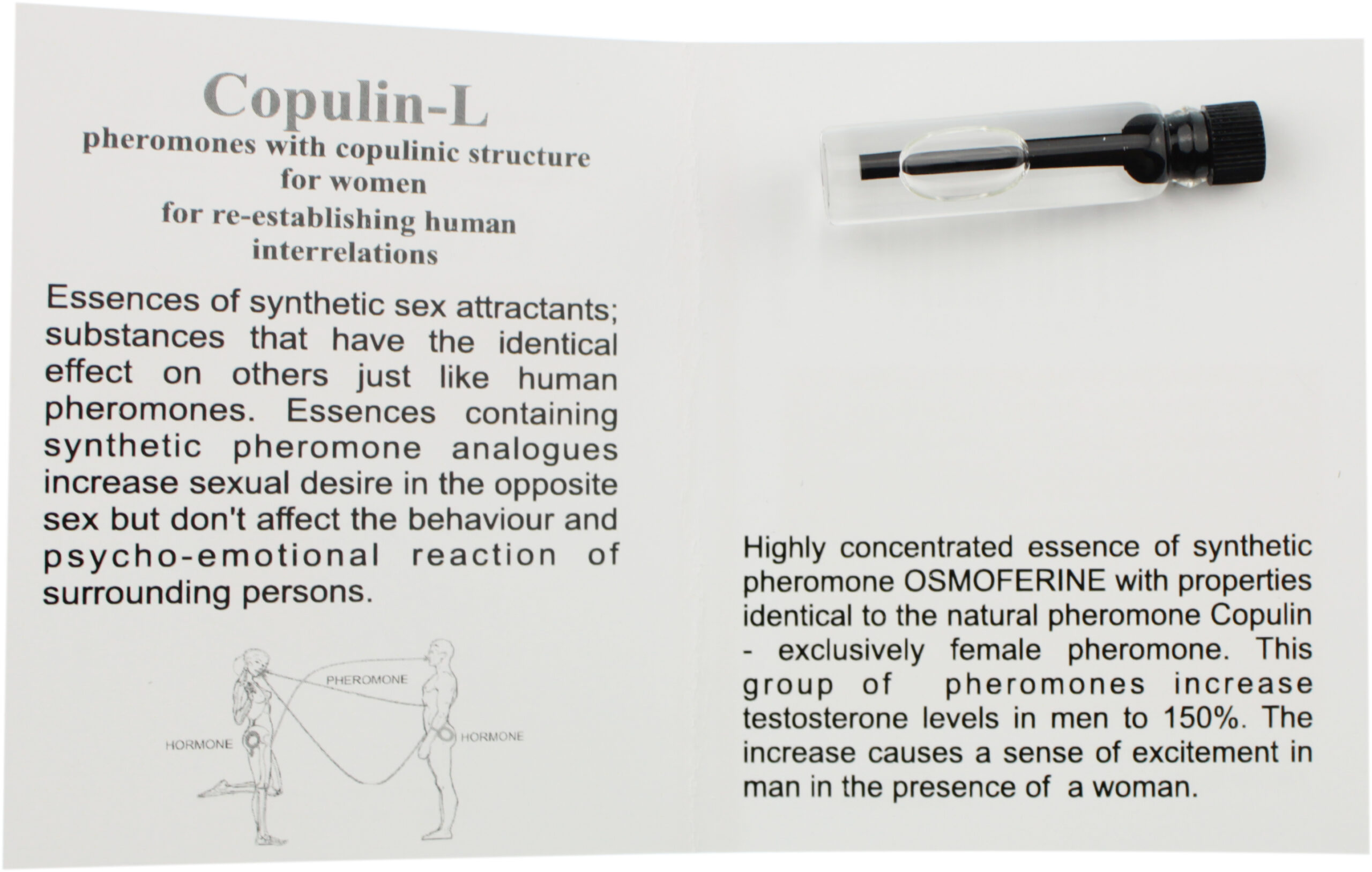 Высококонцентрированная эссенция синтетического феромона ОСМОФЕРИНА, по своим свойствам идентичного натуральному феромону КОПУЛИНУ. КОПУЛИН — исключительно женский феромон. Он выделяется во влагалище в оптимальных соотношениях в течение овуляции