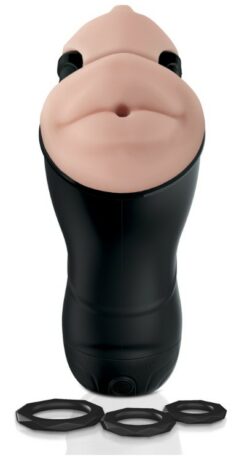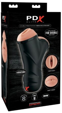 PDX Elite Double Penetration Vibrating Stroker — впечатляющий двойной мастурбатор с реалистичным вагинальным отверстием для чувственных ласк пениса и рабочим ротиком для прекрасной имитации орального секса. Оснащен вибрацией.